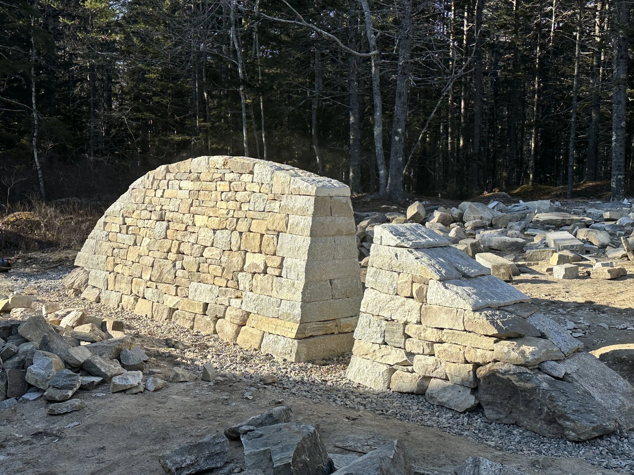 Built entirely from materials found on site: hand-hewn granite blocks from an 1800s barn foundation and lichen-covered fieldstone from the property's woods. The challenge of working only with what's available creates walls that feel rooted in the landscape's history.