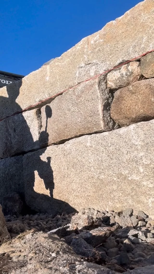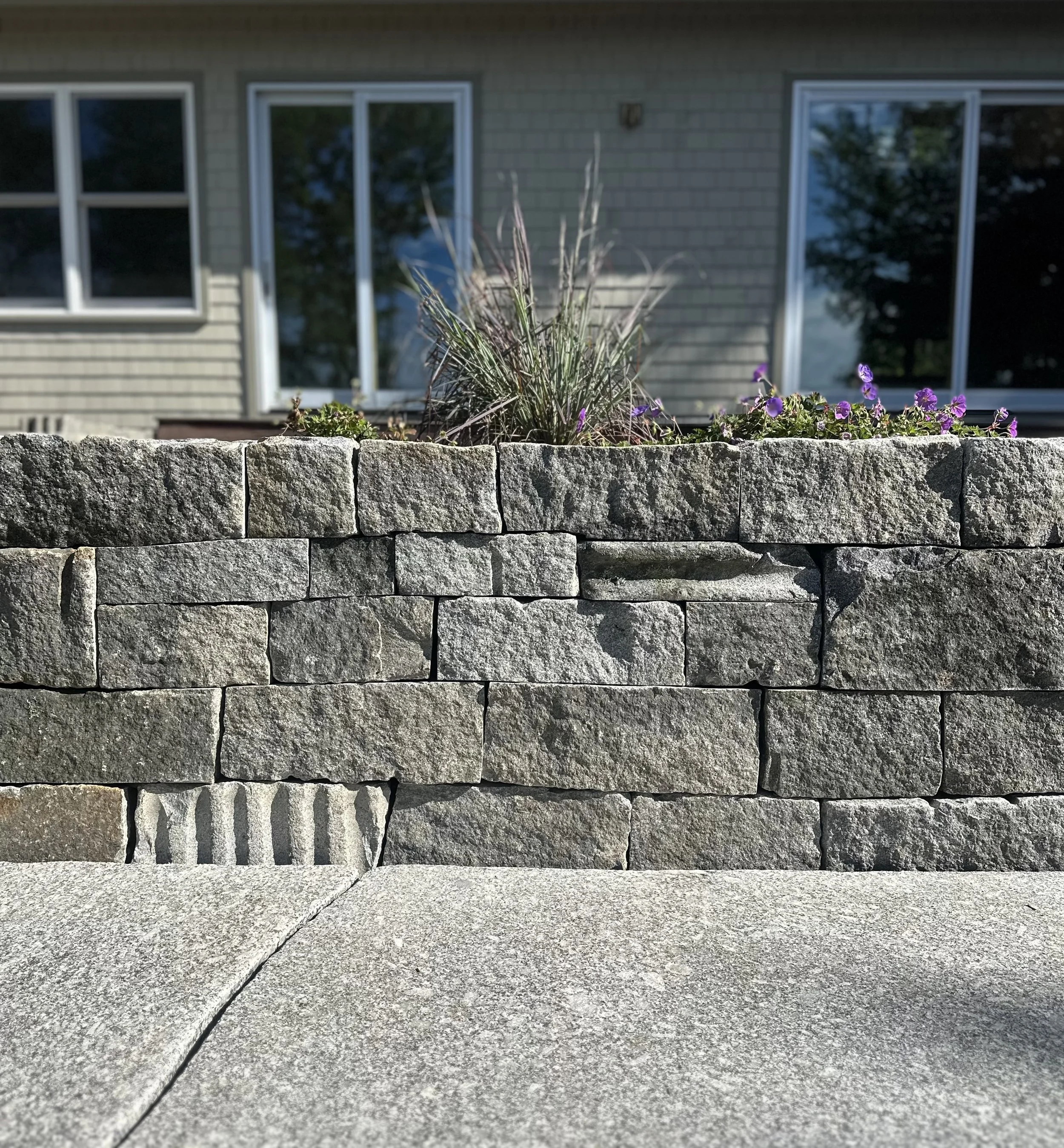 Reclaimed granite planter built with stone from a nearby abandoned quarry. The old tool marks visible in the granite connect the property to local quarrying history while creating a functional garden feature.