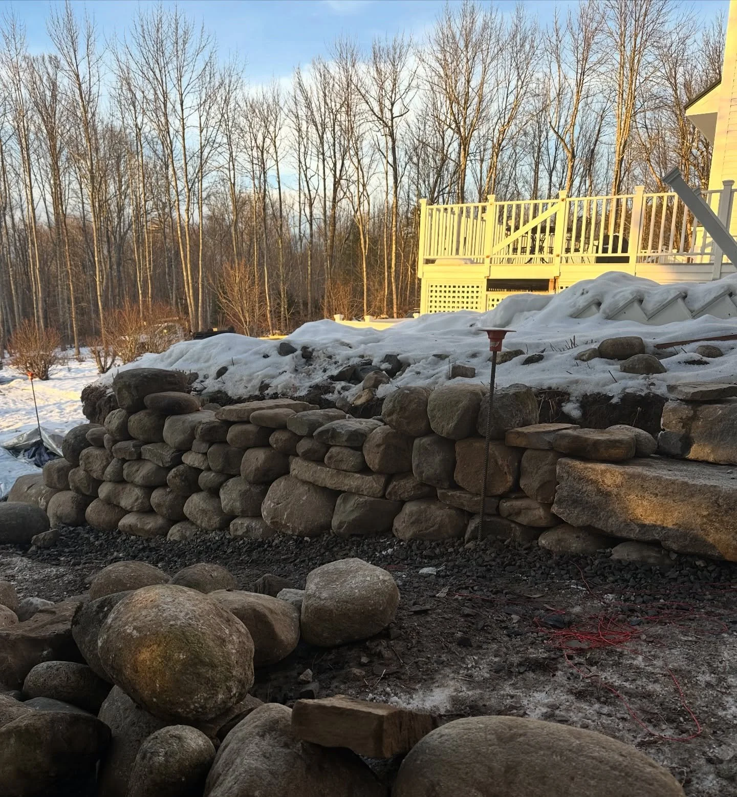After a long permitting process we got the go ahead last winter to rebuild this seawall in Boothbay. Almost two hundred feet long, it starts as a retaining wall for a small island and then juts freestanding into the Damariscotta River. The wall leads to a dry laid stone float and acts as the only access to the client’s boat.