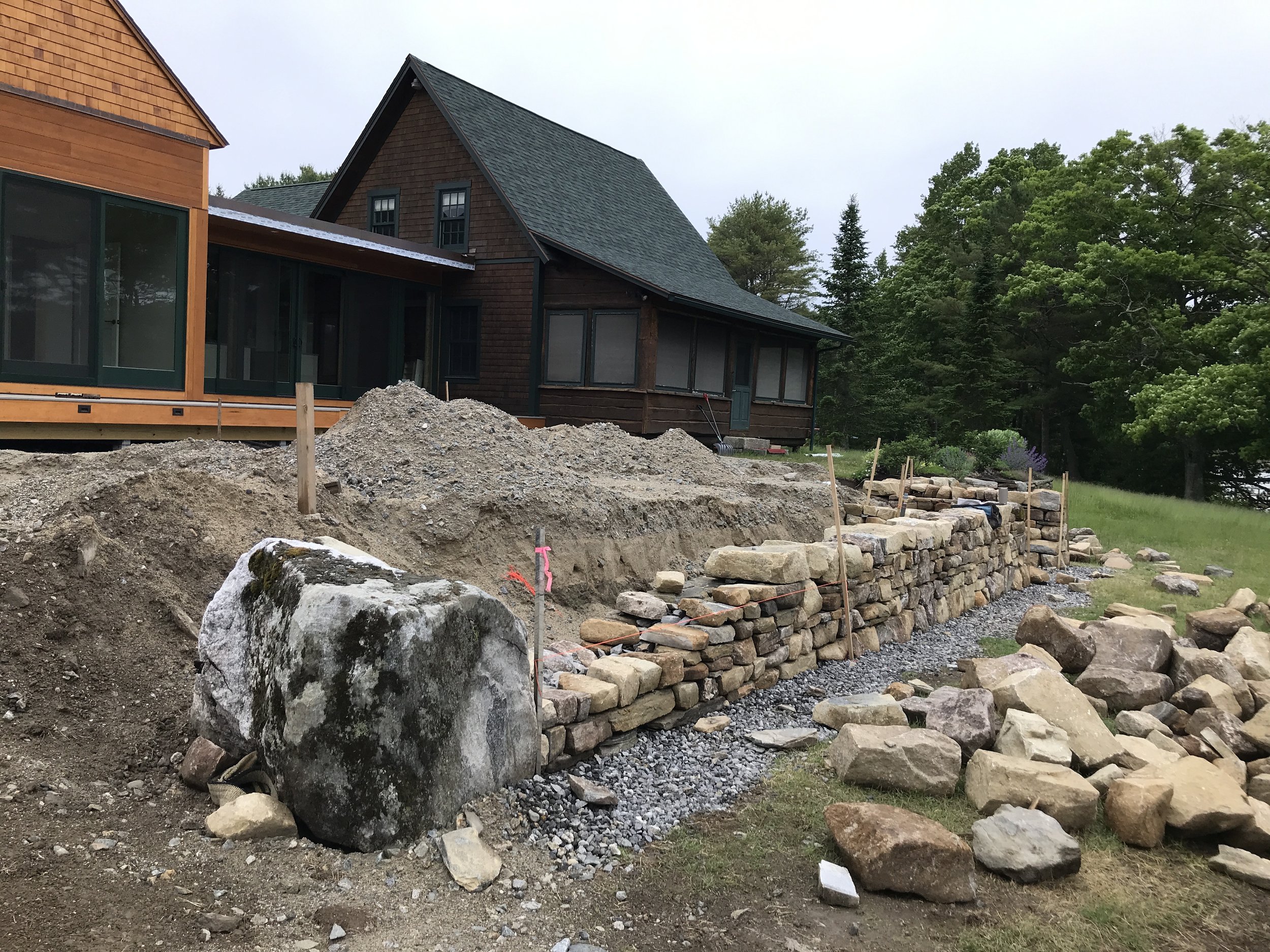 Ted Carter Inspired Landscapes designed this project in Harpswell and brought us in to build the dry laid stone walls and granite steps.